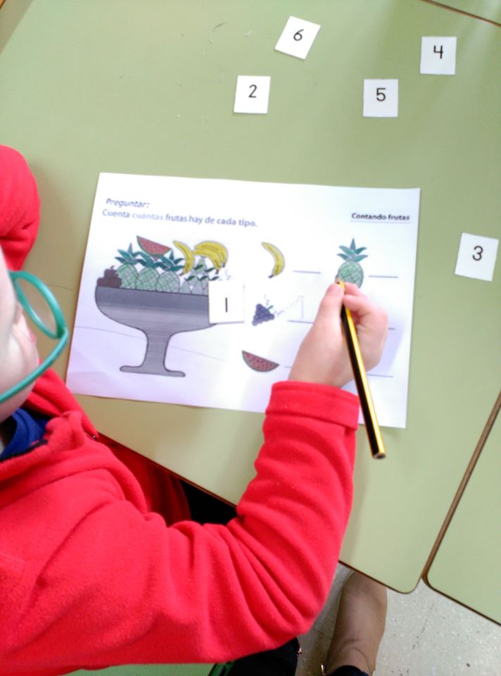 Na aula de PT seguimos traballando coas froitas, aprendemos o seu nome, contamos, asociando cantidade e número e escribimos o número.